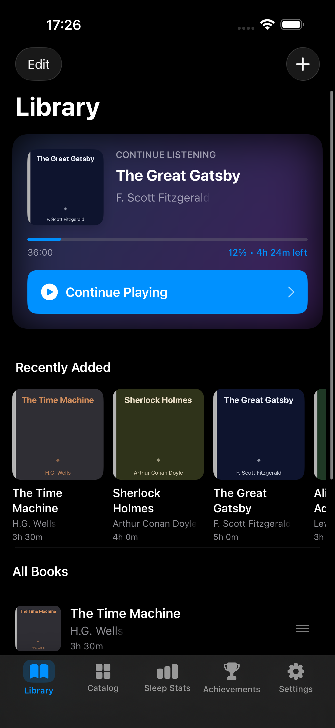 Import MP3, M4A, M4B, FLAC, and other audio files with automatic progress saving